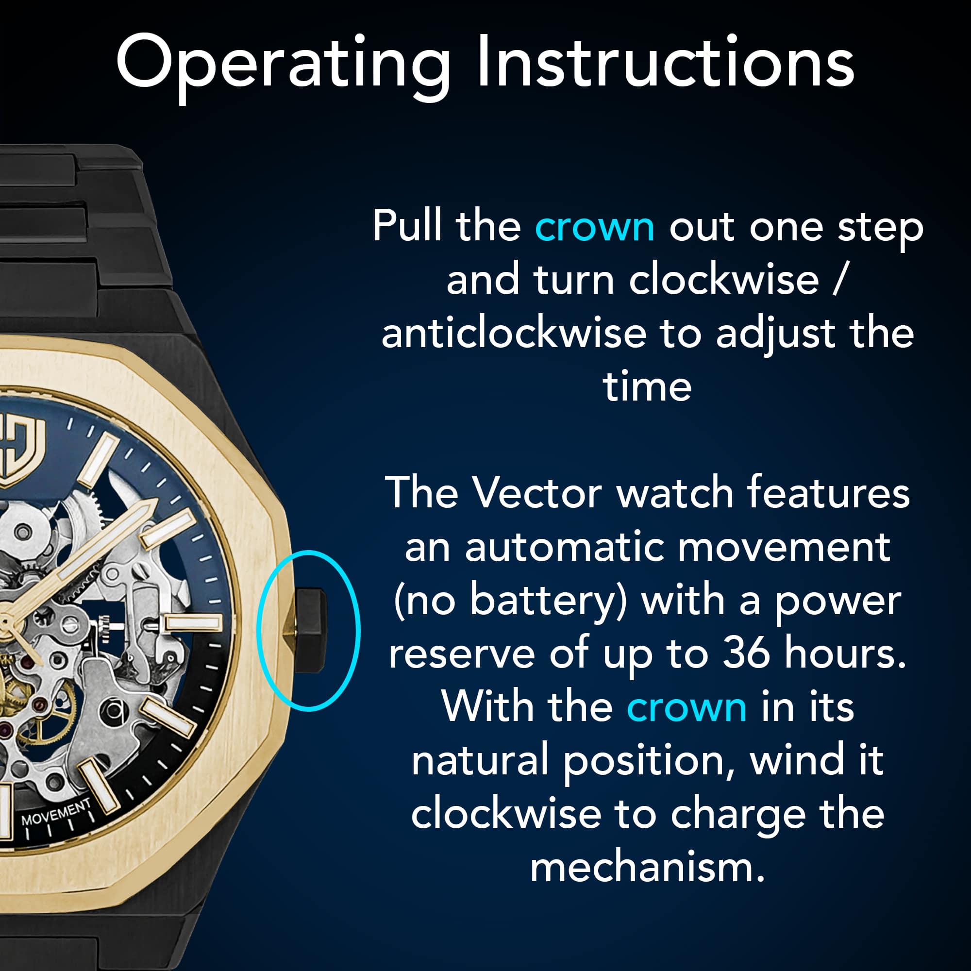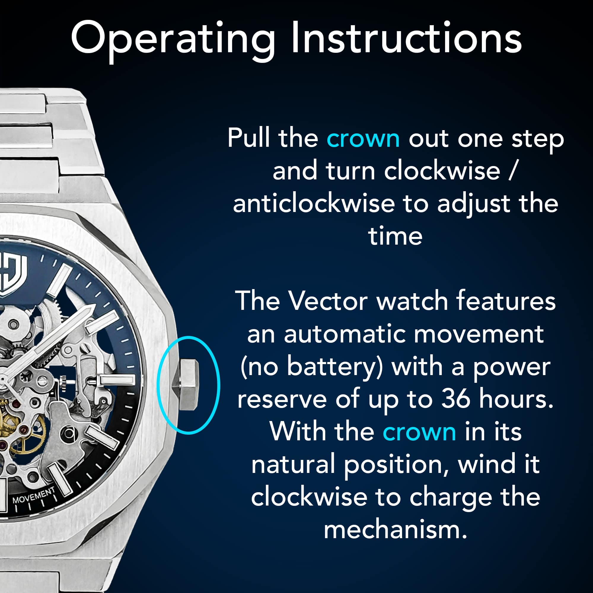 Designed to be an everyday watch that is styled to work with any outfit, the Vector will also handle anything you throw at it - the sapphire crystal means it wont get scratched, the 10ATM water rating means water is never a concern, and the automatic movement means it will be ready to perform at any time, even many years down the line.